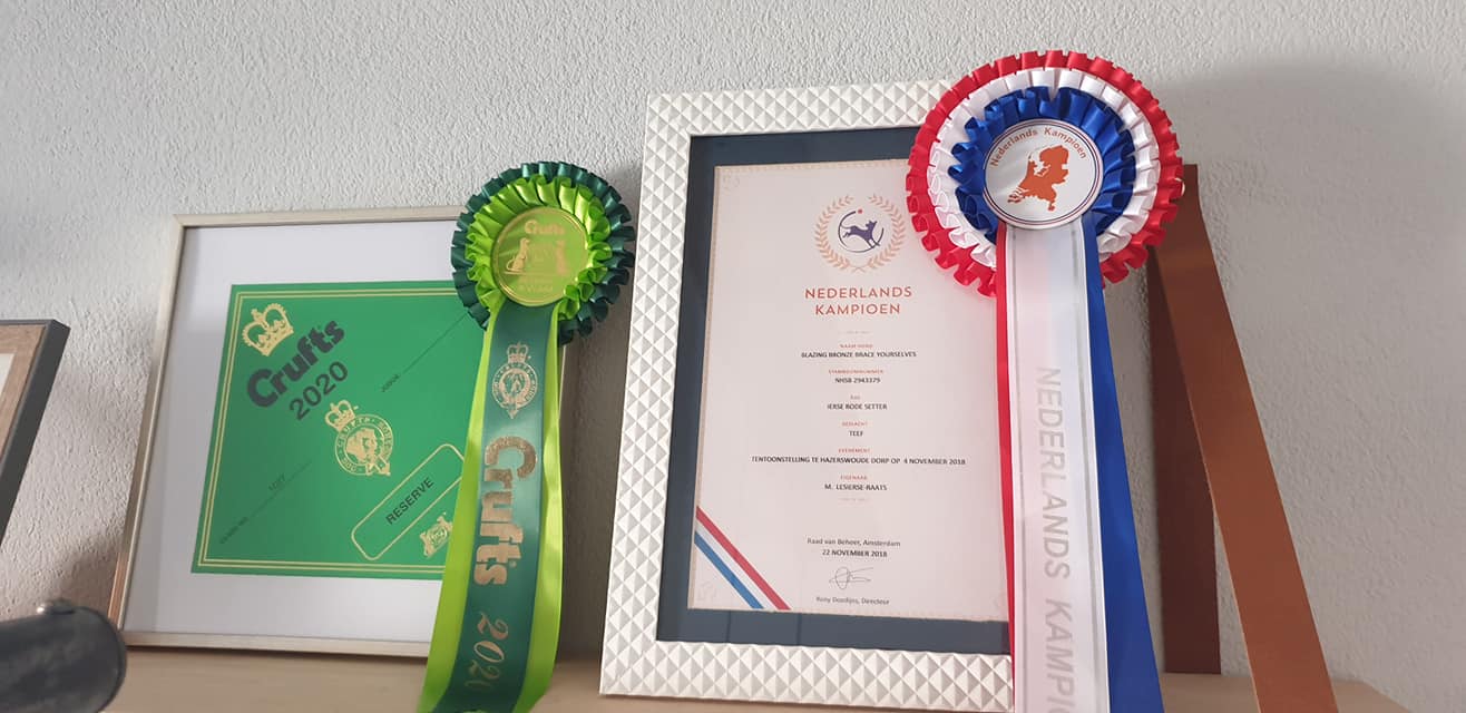 Yade heeft 2 nestjes voortgebracht bij Kennel Blazing Bronze Setters waarvan haar 1e met 11 mooie puppen Blazing bronze brace yourselves X Discovery's new years rocket.